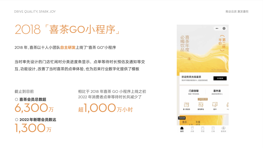 在1月3日喜茶發(fā)布的《喜茶這十年》品牌10周年報(bào)告中提到,截止目前,喜茶會(huì)員總數(shù)超6300萬(wàn),2022年新增會(huì)員數(shù)達(dá)1300萬(wàn)。相比于2018年「喜茶GO」小程序上線之初,2022年消費(fèi)者點(diǎn)單等待時(shí)長(zhǎng)共減少了超1000萬(wàn)小時(shí)。