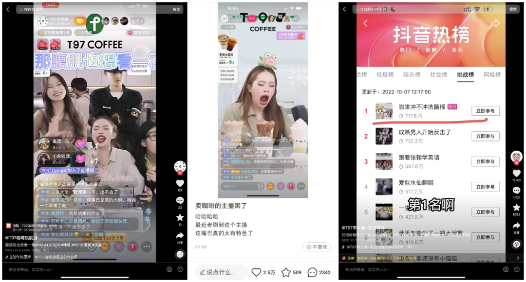 10月左右,抖音上的T97咖啡直播間的喊麥主播「大嘴妹」,靠唱一句現(xiàn)象級(jí)的廢話喊麥賣貨的方式,讓其直播間在抖音本地生活爆火,當(dāng)時(shí)成功登頂抖音本地生活榜,躋身全國(guó)抖音團(tuán)購(gòu)榜第一名。T97是一家連鎖咖啡新品牌,本質(zhì)賺的是加盟商的錢,直播間帶貨的是單價(jià)低至6.9元的美式和拿鐵,短期內(nèi)容易對(duì)泛人群產(chǎn)生轉(zhuǎn)化。通過(guò)短視頻的線上低成本品牌營(yíng)銷,對(duì)T97的連鎖加盟商來(lái)說(shuō),相當(dāng)于總部幫加盟店引流。據(jù)稱,爆火后,前來(lái)咨詢加盟甚至當(dāng)場(chǎng)交意向金的客戶也迅速翻倍增長(zhǎng)。