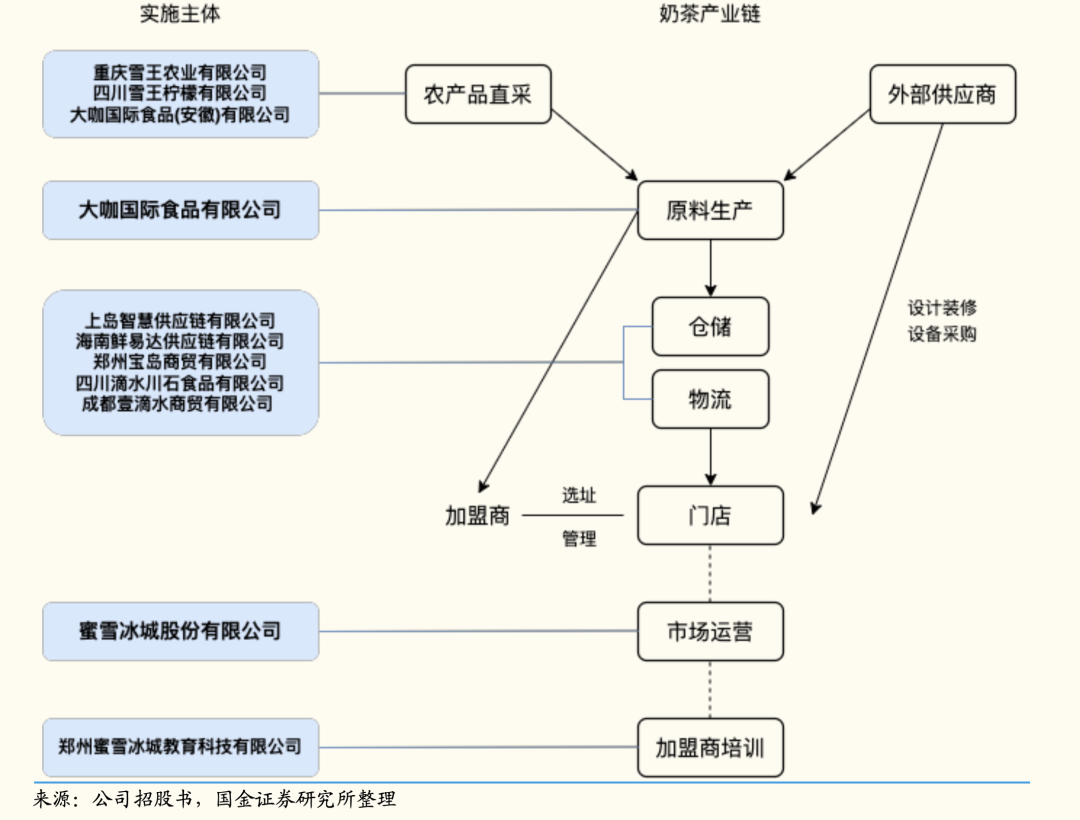 蜜雪冰城既要保證在消費(fèi)者端的絕對(duì)低價(jià)、以保證基本盤和競(jìng)爭(zhēng)身位,也要在加盟商這里獲得足夠的利潤(rùn)空間,這就要求其對(duì)于供應(yīng)鏈的成本控制要求是極高的。因此,蜜雪冰城通過(guò)自建工廠直接供貨,自建產(chǎn)地、工廠、倉(cāng)儲(chǔ)物流,已經(jīng)形成完整的供應(yīng)鏈體系,將成本壓縮到極致。基于龐大的門店需求,相較同類原材料,蜜雪冰城的原料成本能夠便宜10%。