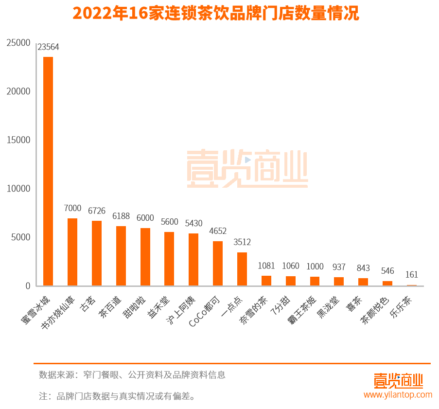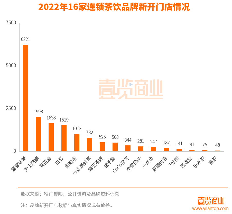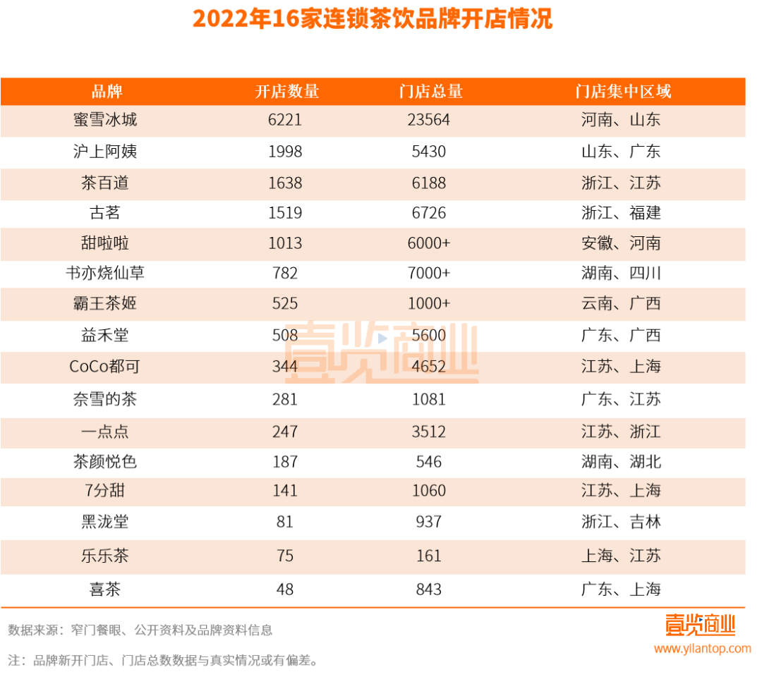 據(jù)壹覽商業(yè)不完全統(tǒng)計(jì),國(guó)內(nèi)主要的16家連鎖茶飲品牌,在2022年共新開門店約15608家,門店存量超74300家。