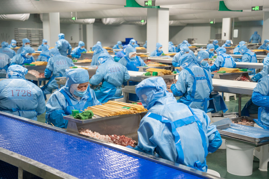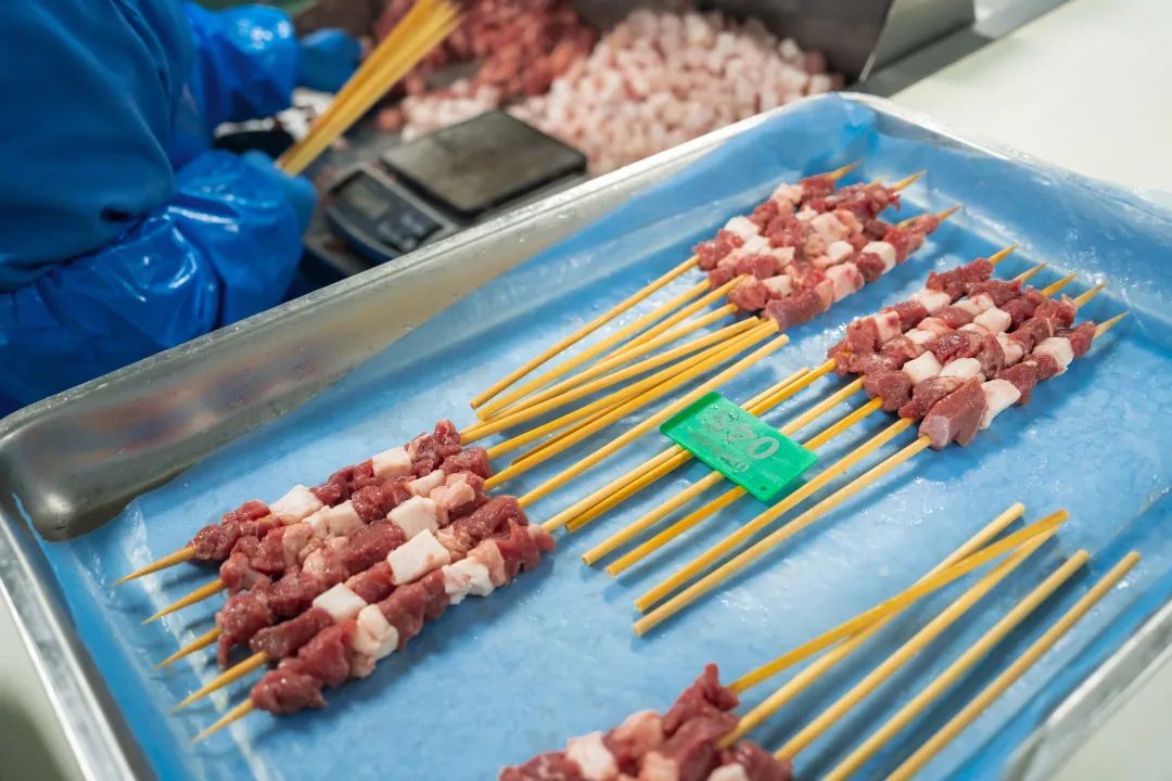 和采購冷凍肉再解凍穿制串品不同,張利的供應(yīng)鏈部分產(chǎn)品采用鮮肉運輸,通過中央工廠的加工車間分割、腌制、穿串,再通過速凍技術(shù)運輸?shù)较掠危挥幸淮嗡賰霰WC了肉質(zhì)的鮮嫩。