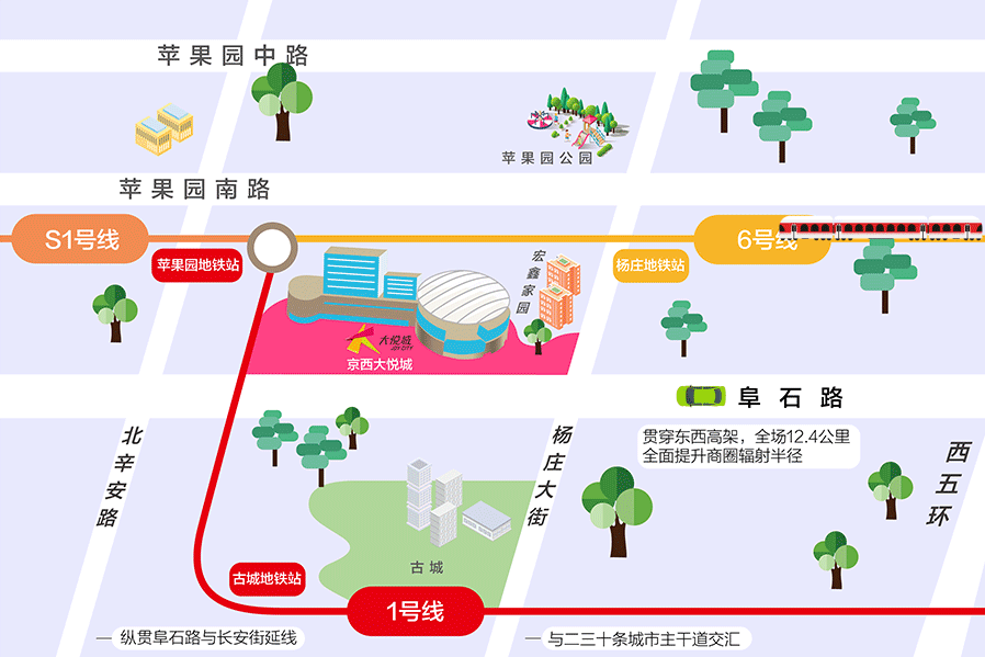 京西大悅城位于石景山區(qū)阜石路北側(cè),阜石路高架引橋自駕直達(dá),連接北京最大立體化交通網(wǎng)絡(luò)——蘋果園立體交通樞紐,通過(guò)B2層與L3層實(shí)現(xiàn)與地鐵1號(hào)線、6號(hào)線、S1線輕軌總站三軌交匯,BRT快速公交線路直接接駁,交通資源的唯一性和不可替代性,使其具備了以西部為核心向北京市全面輻射的地緣天賦優(yōu)勢(shì)。