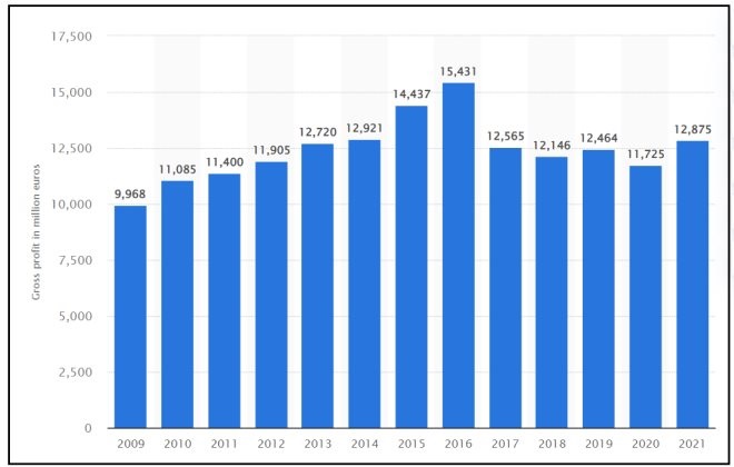 2009年—2021年,宜家家居全球業(yè)務(wù)總利潤(單位:百萬歐元)。圖源:Statista
