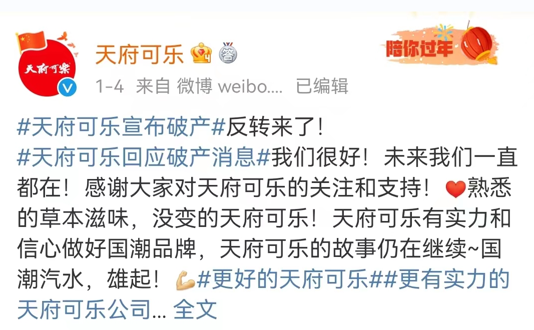 隨著事件的不斷發(fā)酵,“天府可樂申請破產清算”的話題也沖上了微博熱搜,但在1月4日,天府可樂官方微博發(fā)布聲明“我們很好,未來我們一直都在!