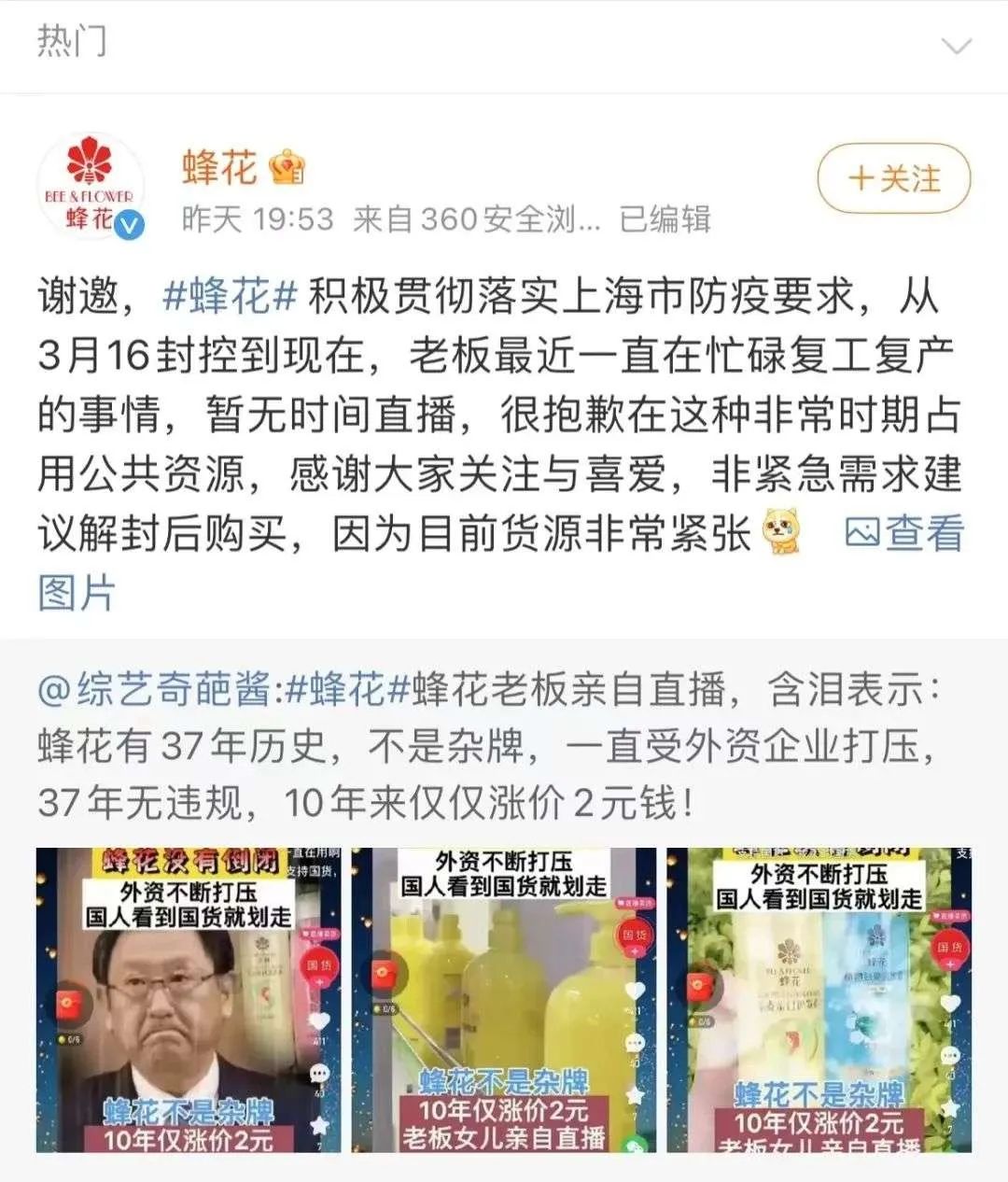 次日,蜂花官方微博親自辟謠,表示配圖中的人物不是蜂花老板,老板一直在忙復工復產的事情,暫無時間直播。