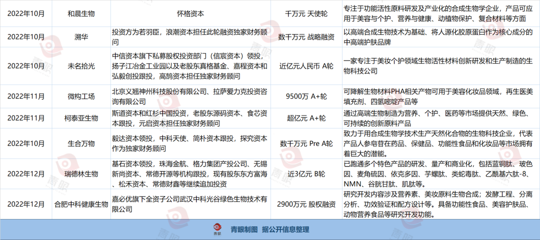 從化妝品行業(yè)來看,據(jù)青眼不完全梳理發(fā)現(xiàn),2022年獲得融資的一眾合成生物相關(guān)企業(yè)中,藍(lán)晶微生物、未名拾光、百葵銳生物、態(tài)創(chuàng)生物、生合萬物等20多家企業(yè)都有涉足化妝品領(lǐng)域。