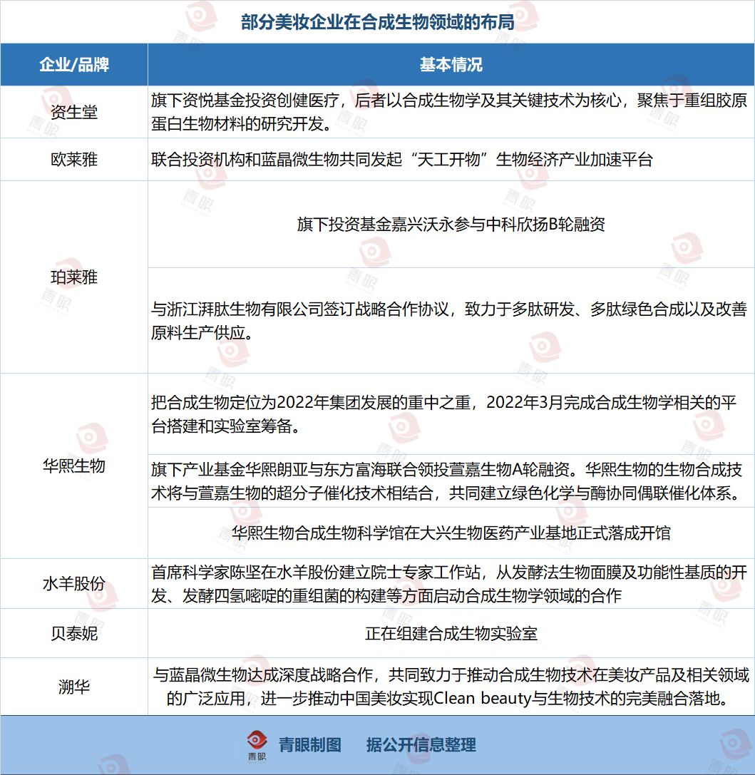其它諸如資生堂、珀萊雅、貝泰妮、水羊股份等企業(yè)也都在通過投資、達(dá)成戰(zhàn)略合作、組建合成生物實(shí)驗(yàn)室、引入科學(xué)家等方式入局合成生物學(xué)技術(shù)應(yīng)用領(lǐng)域。