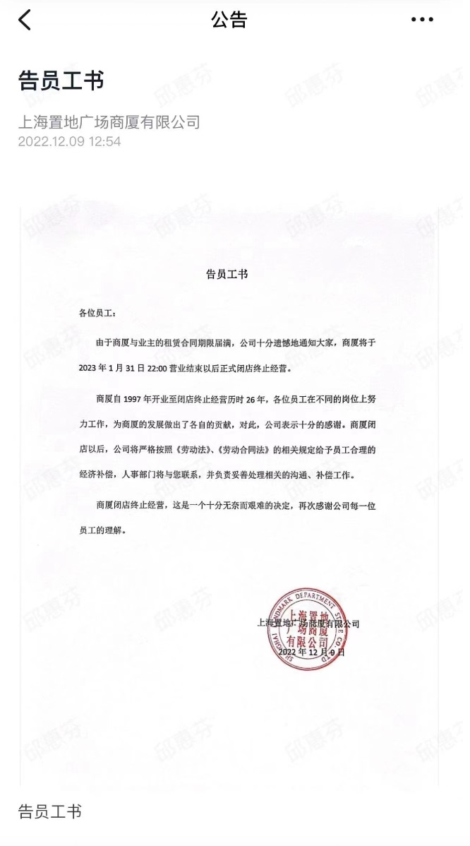 12月9日,上海置地廣場(chǎng)商廈發(fā)布《告員工書》,稱因與業(yè)主的租賃合同到期,項(xiàng)目將于2023年1月31日22:00營(yíng)業(yè)結(jié)束后正式終止?fàn)I業(yè),這已經(jīng)是12月以來上海第二家宣布關(guān)閉的商場(chǎng)。