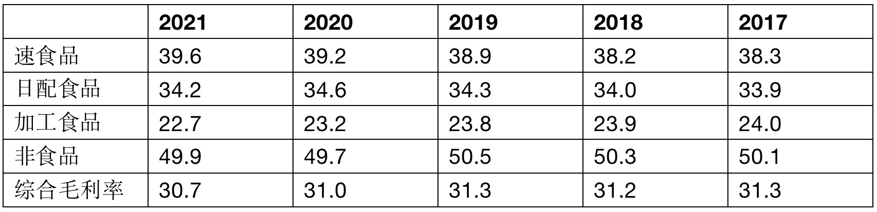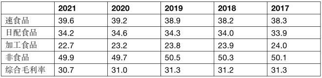 羅森的總體毛利率水平在30%至31%之間,從數(shù)據(jù)結(jié)構(gòu)看,受到了包括香煙在內(nèi)的外購加工食品的毛利影響。
