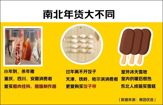 北方過(guò)年離不開餃子。美團(tuán)優(yōu)選數(shù)據(jù)顯示,餃子餡擠水袋、餃子簾、硅膠揉面墊、搟面杖等包餃子用具熱銷。其中,天津、鐵嶺、哈爾濱、唐山、沈陽(yáng)、濟(jì)南、承德、大連、滄州、廊坊消費(fèi)者更愛下單餃子簾,而愛下單搟面杖的消費(fèi)者多集中在東北三省。此外,東北因室內(nèi)供暖后足夠熱,雪糕成為招待親友、降溫解饞的熱選年貨。東北三省雪糕下單高峰從春節(jié)前三周就已開啟。