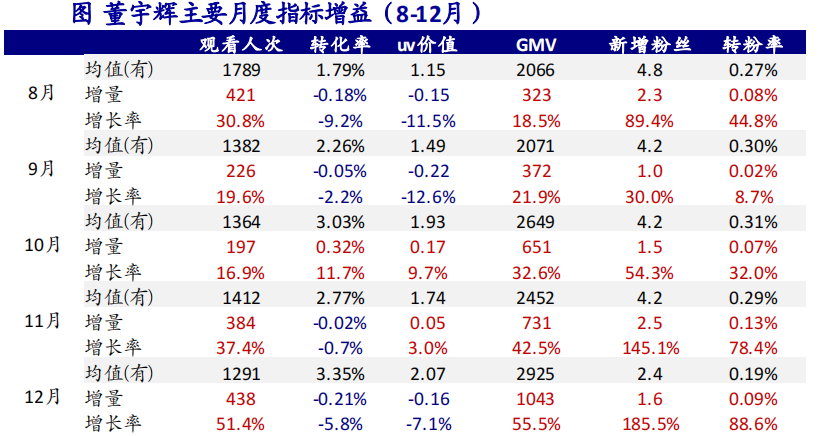 而且復(fù)盤2022年8-12月份東方甄選直播間的數(shù)據(jù)也不難看出,董宇輝對(duì)于東方甄選的觀看次數(shù)、GMV的提升均有明顯的帶動(dòng)作用。以去年12月為例,有董宇輝直播日觀看人次均值、轉(zhuǎn)粉率、GMV分別為1291萬(wàn)、0.19%、2925萬(wàn)。
