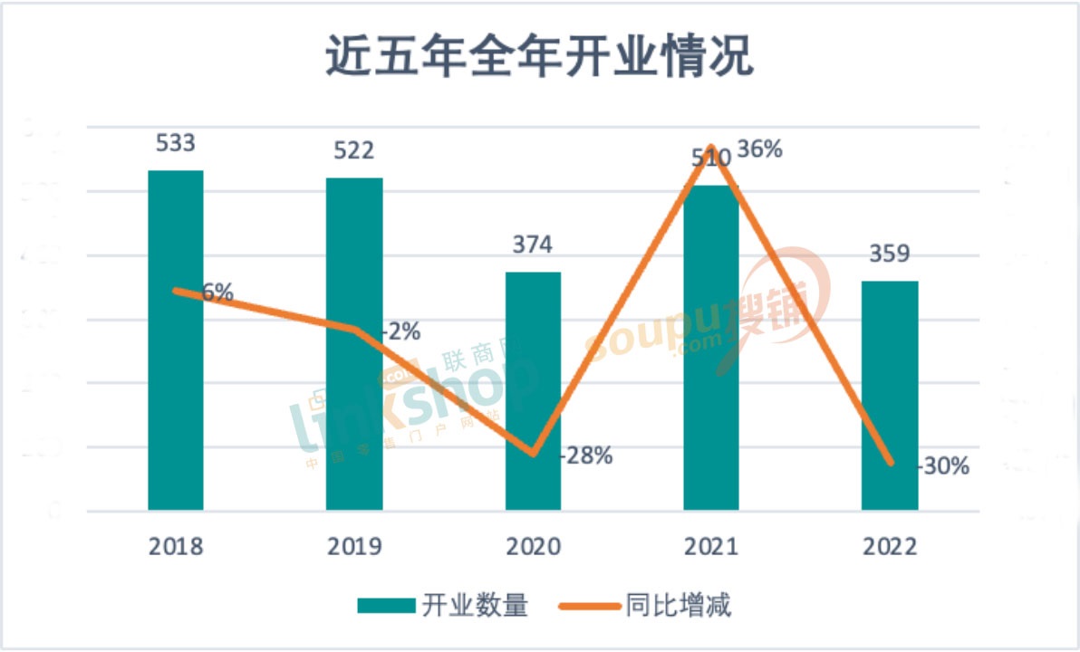 具體數(shù)據(jù)上看, 2018年開業(yè)數(shù)量最多至533個,且同比上漲了6%;2021年是近五年漲幅最大的,上漲了36%至510個,主要是因為2020年受疫情影響嚴(yán)重導(dǎo)致開業(yè)量暴跌,而2021年疫情暫緩開業(yè)量劇增。同時,2021年的搶眼表現(xiàn)也使得2022年的開業(yè)數(shù)量同比是近五年下滑幅度最大的。