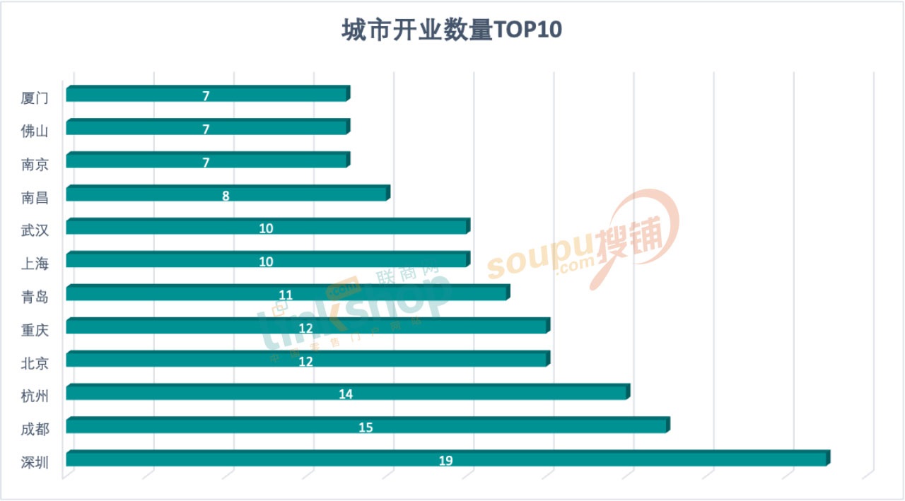 統(tǒng)計的城市活躍TOP10榜中,上海丟掉榜首之位,僅以10個開業(yè)數(shù)量與武漢并列第七;榜首之位被深圳以19個開業(yè)數(shù)量占據(jù),而去年的城市榜榜首的上海開業(yè)數(shù)量是44個;成都以15個開業(yè)數(shù)量位至次席,杭州則開出14個新項目,北京和重慶各12個緊隨其后;南昌2022年表現(xiàn)搶眼,也以8個開業(yè)數(shù)量躋身榜單中,南京、佛山和廈門各7個并列第十。