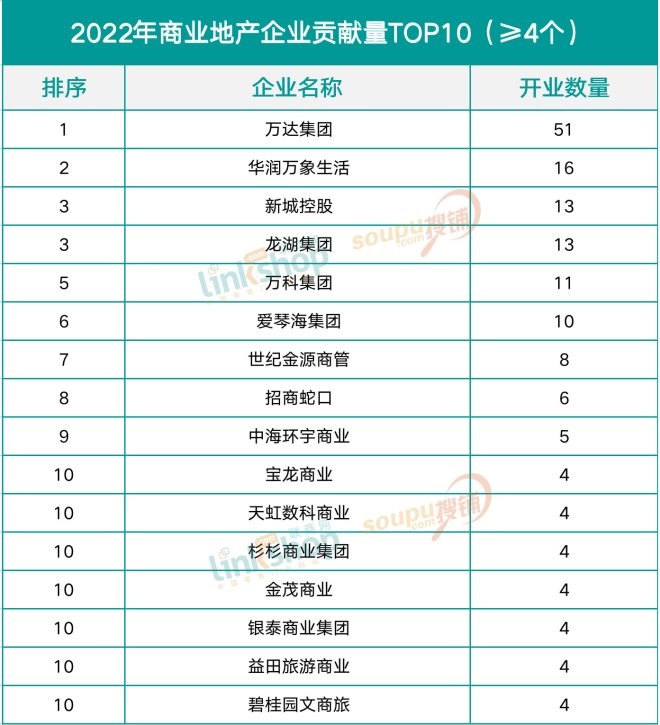 同時,在TOP10的排行中(因開業(yè)量一樣有不少并列的,故榜單實際企業(yè)數(shù)量16家),分別是萬達集團、華潤萬象生活、新城控股、龍湖集團、萬科集團、愛琴海集團、世紀(jì)金源商管、招商蛇口、中海環(huán)宇商業(yè)、寶龍商業(yè)、天虹數(shù)科商業(yè)、杉杉商業(yè)集團、金茂商業(yè)、銀泰商業(yè)、益田旅游商業(yè)、碧桂園文商旅。