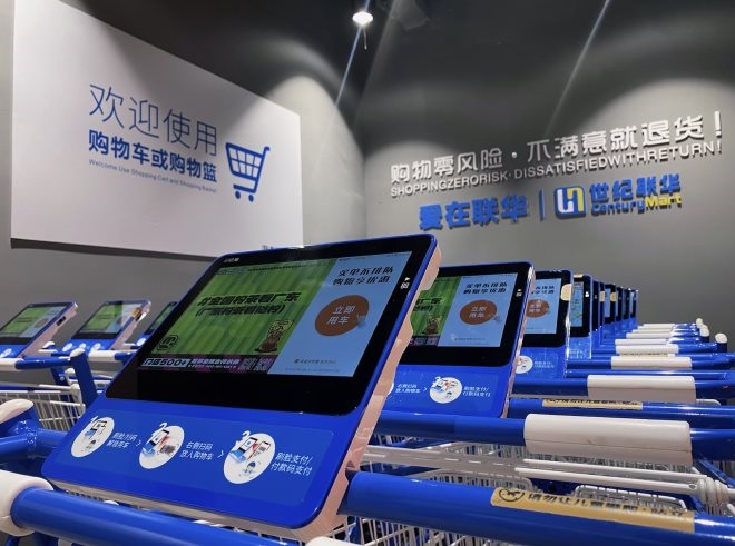 另外,值得一提的是,該店也是全國第二家、義烏首家全店使用智能購物車的大型商超,智能購物車設(shè)有智慧屏、重量感知、圖像識別等多種傳感器,可以實現(xiàn)智能導(dǎo)航、智能導(dǎo)購、自助結(jié)算、人臉識別、精準(zhǔn)推送優(yōu)惠券等多項數(shù)字化購物體驗。