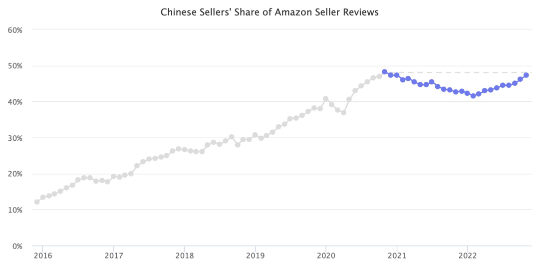 亞馬遜中國賣家在美國市場(chǎng)反饋評(píng)論總量占比及預(yù)測(cè) 數(shù)據(jù)來源:Marketplace Pulse