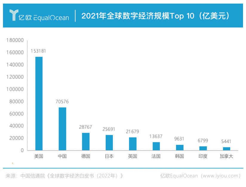 從當(dāng)前國際格局來看,美、中、歐已成為數(shù)字經(jīng)濟(jì)三極。根據(jù)中國信通院發(fā)布的《全球數(shù)字經(jīng)濟(jì)白皮書(2022年)》,從規(guī)模上來看,美國數(shù)字經(jīng)濟(jì)多年蟬聯(lián)世界第一,規(guī)模達(dá)到15.3萬億美元,中國則常年穩(wěn)居第二,規(guī)模為7.1萬億美元,占GDP比重由2012年的21.6%提升至2021年的39.8%。占比上,德國、英國、美國數(shù)字經(jīng)濟(jì)占GDP比重位列前三位,均超過65%。