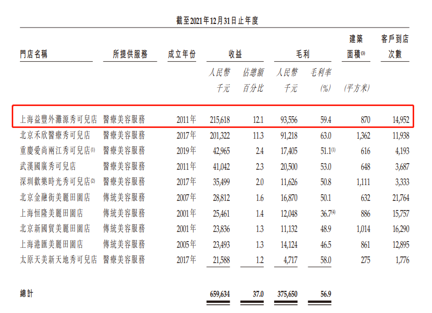 值得一提的是,隨著近幾年美麗田園營(yíng)收的快速增長(zhǎng),2021年,美麗田園單店最高營(yíng)收更是突破了2億元。其中,單店收益最高的是位于上海的益豐外灘園秀可兒店,2021年度總收益為2.16億元,毛利為9355.6萬(wàn)元,毛利率為59.4%。其次,則是位于北京的禾欣醫(yī)療秀可兒店,單店年度收益為2.01億元,毛利為9121.1萬(wàn)元,毛利率達(dá)到了63%。