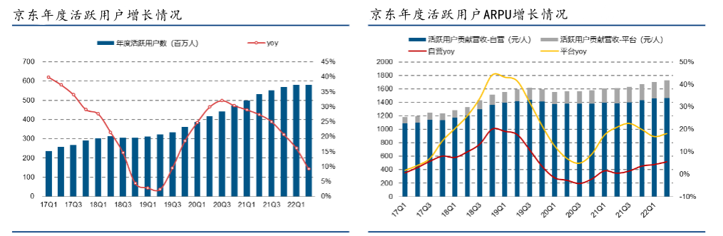 由于國內(nèi)互聯(lián)網(wǎng)流量紅利早也消失,當(dāng)下多家電商購物APP的獲客成本一直被不斷拉高。難以尋找新增流量之下,即使頭部電商購物平臺的用戶增長也接近天花板。以京東為例,其在2021年一季度時年度活躍用戶以及由年度活躍用戶所貢獻(xiàn)的自營收入在增速上就已出現(xiàn)明顯放緩。