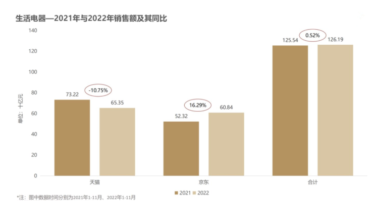 而從2022年來看,京東的這種優(yōu)勢仍在保持。據(jù)久謙中臺數(shù)據(jù)顯示,去年1-11月份,國內(nèi)生活電器總體呈小幅度增長,其中京東平臺增速明顯,達(dá)16.29%;但天貓平臺卻呈現(xiàn)下滑趨勢。