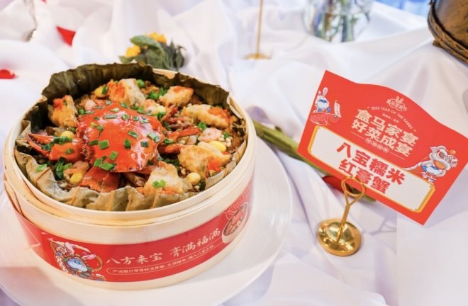 比如在中國(guó)臺(tái)灣、福建等地,逢年過(guò)節(jié)常見(jiàn)的經(jīng)典名菜——紅蟳米糕,采用時(shí)令海鮮紅膏蟹及糯米制成,經(jīng)過(guò)改良,變身“八寶糯米紅膏蟹”在盒馬上架。這道菜選用帶膏率在15%-20%之間的紅膏蟹,將太湖糯米經(jīng)過(guò)鮑汁煨制后加入蝦仁、鮑魚丁、豌豆、瑤柱等8種食材,做成咸鮮口味的八寶糯米飯。用戶買回家之后,用附贈(zèng)的蒸籠上鍋隔水加熱15分鐘,即可解鎖一道大餐。