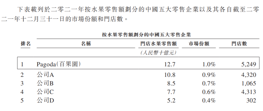 最新的招股書(shū)顯示,2021年百果園在水果零售行業(yè)占據(jù)的市場(chǎng)份額為1%,排名第一,是第二名的2.8倍。截至2021年年底,百果園擁有5351家線(xiàn)下門(mén)店,分布于全國(guó)130多個(gè)城市;2021年實(shí)現(xiàn)營(yíng)業(yè)收入102.89億元。