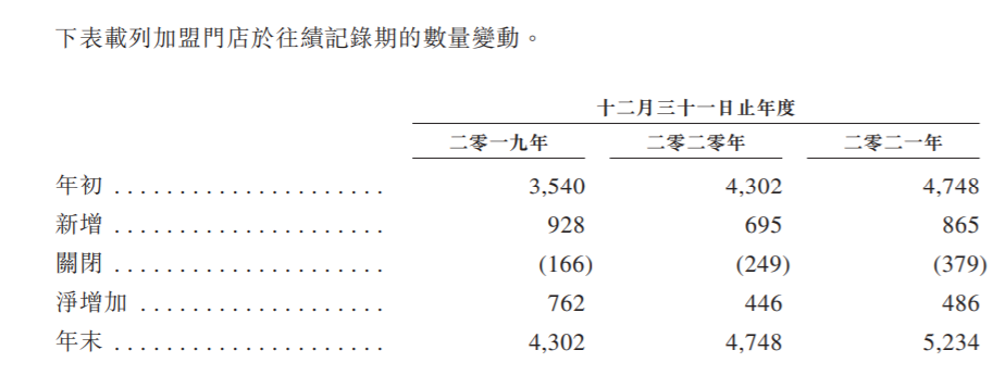 據(jù)招股書(shū)顯示2019、2020和2021年新增門(mén)店分別為928家、695家和865家,關(guān)閉門(mén)店則分別為166家、249家、379家。在激烈的市場(chǎng)競(jìng)爭(zhēng)中,肉眼可見(jiàn)的線(xiàn)下門(mén)店的增速已經(jīng)放緩,說(shuō)明越來(lái)越多的加盟商選擇“急流勇退”。