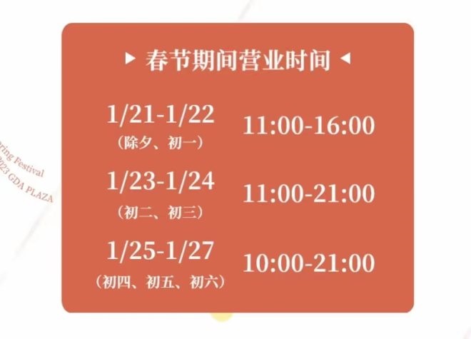 國大城市廣場:1月21日—22日(除夕、大年初一)11:00—16:00,1月23日—24日(大年初二、大年初三)11:00—21:00,1月25日—27日(大年初四、大年初五、大年初六)10:00—21:00,1月28日(大年初七)起恢復(fù)正常營業(yè)時間。