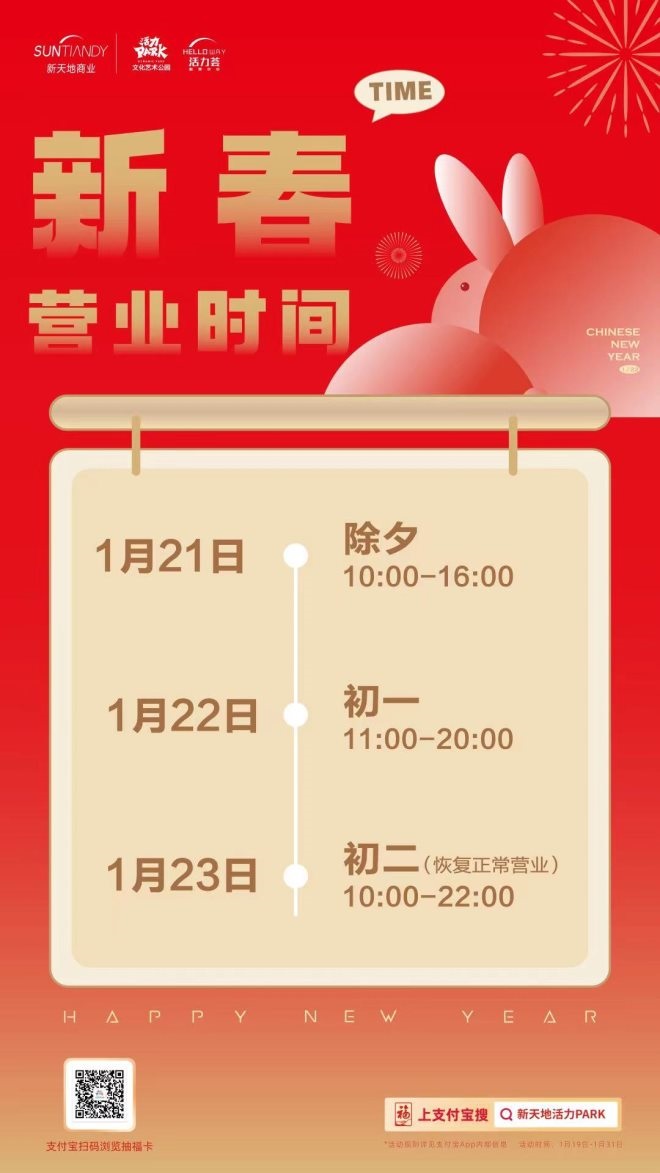 新天地活力Park:1月21日(除夕)10:00—16:00,1月22日(大年初一)11:00—20:00,1月23日(大年初二)起恢復(fù)正常營業(yè)時間。