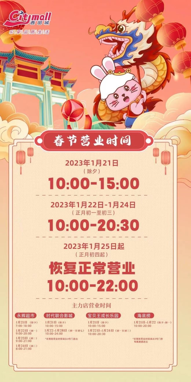 七堡花園城:1月21日(除夕)10:00—17:00,1月22日—27日(大年初一至初六)10:00—22:00,1月28日(大年初七)起恢復(fù)正常營業(yè)時間。
