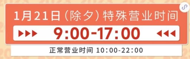 來福士:1月21日(除夕)10:00—16:00,1月22日(大年初一)11:00—20:00,1月23日(大年初二)11:00—21:00,1月24日(大年初三)起恢復(fù)正常營業(yè)時間。