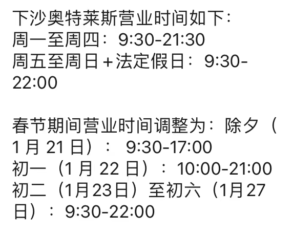 下沙奧特萊斯:1月21日(除夕)9:30—17:00,1月22日(大年初一)10:00—21:00,1月23日—27日(大年初二至初六)9:30—22:00,1月28日(大年初七)起恢復(fù)正常營業(yè)時間。