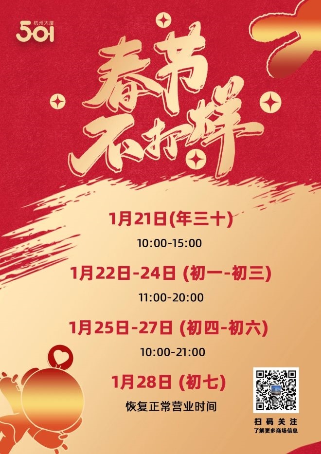 杭州大廈501城市廣場:1月21日(除夕)10:00—15:00,1月22日—24日(大年初一至初三)11:00—20:00,1月25日—27日(大年初四至初六)10:00—21:00,1月28日(大年初七)起恢復(fù)正常營業(yè)時間。
