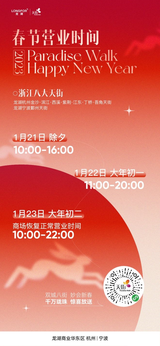 龍湖杭州金沙天街、龍湖杭州吾角天街、龍湖杭州濱江天街、龍湖杭州西溪天街、龍湖杭州紫荊天街、龍湖杭州江東天街、龍湖杭州丁橋天街:1月21日(除夕)10:00—16:00,1月22日(大年初一)11:00—20:00,1月23日(大年初二)起恢復(fù)正常營業(yè)時間。