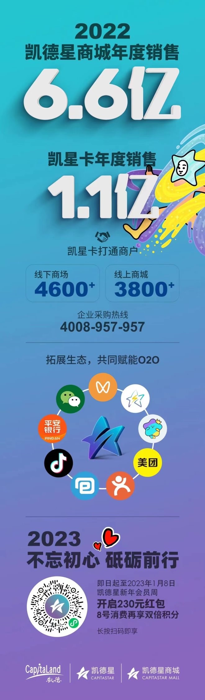 此外,凱德攜手永璞咖啡推出聯(lián)名版凱星卡,購卡即送的啡常凱心“富鱷袋”周邊產(chǎn)品也異常吸睛,不僅引發(fā)消費者紛紛打卡曬照,也實現(xiàn)了線上銷售到線下消費的完整閉環(huán)。凱星卡作為凱德2022年正式推出的線上線下一站式商業(yè)預(yù)付卡,年度銷售達(dá)1.1億元,打通了凱德線下商場4,600+商戶和線上商城3,800+商戶。