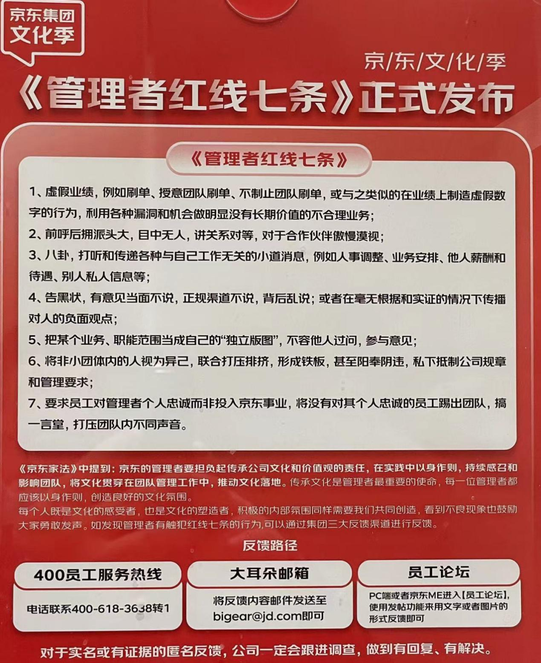 反思會(huì)由HRBP帶領(lǐng),每個(gè)人上臺(tái)發(fā)言,深挖自己的思想根源,總結(jié)自己做得不好的地方,現(xiàn)場(chǎng)有專人做記錄。針對(duì)管理者的工作作風(fēng),京東發(fā)布了管理者的7條紅線,11個(gè)原則。京東把這些內(nèi)容做成宣傳圖,甚至張貼在了辦公大樓的廁所內(nèi)。