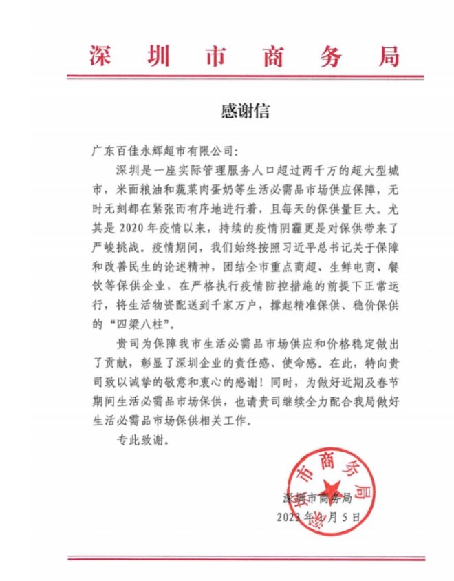 永輝超市獲深圳市商務(wù)局感謝信 保供穩(wěn)價(jià)受肯定