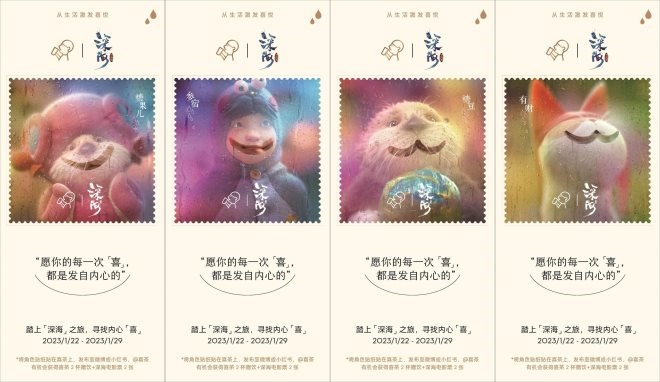 1月22日到1月23日,消費者購買喜茶,就能隨杯獲贈“聯(lián)動限定貼紙”。為了讓消費者在春節(jié)感受到更多喜悅,喜茶從《深海》的諸多角色形象中選擇了4款治愈系微笑的形象,以電影票根為靈感設計了系列聯(lián)動限定貼紙。