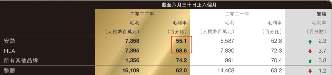 毛利雖下降,但FILA擁有的68.6%的毛利率仍高于自主品牌安踏的55.1%。所以,盡管安踏主品牌和其他品牌毛利率均有所上升,仍難挽回集團整體毛利率的下滑的事實。