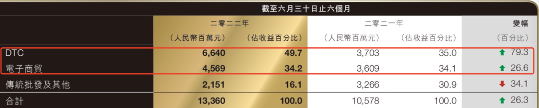 為持續(xù)優(yōu)化線下門店,抵御FILA下滑帶來的負面影響,從2020年起,安踏開始進行DTC轉型,該模式核心在于將經銷商門店轉變?yōu)橹睜I門店。到2022年上半年,來自DTC的收入為66.4億元,同比增長79.3%。