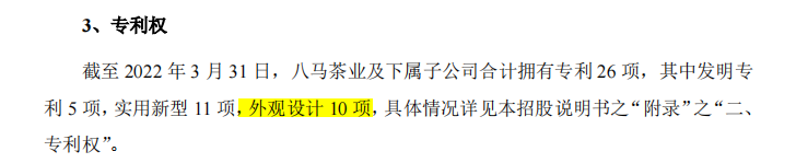 細(xì)看研發(fā)費(fèi)用的構(gòu)成比例不難發(fā)現(xiàn),其研發(fā)設(shè)計(jì)費(fèi)用占比接近一半。再結(jié)合八馬茶業(yè)擁有的26項(xiàng)專(zhuān)利權(quán),僅外觀(guān)設(shè)計(jì)就占了10項(xiàng)。