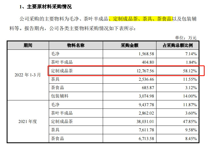 原材料采購(gòu)數(shù)據(jù)方面也可窺見(jiàn)端倪,八馬茶業(yè)雖然在生產(chǎn)模式上把自主生產(chǎn)放在最前面,但數(shù)據(jù)顯示,基本都有對(duì)外采購(gòu)的情況,尤其是定制成品茶,采購(gòu)金額占采購(gòu)總額比例達(dá)到了58.12%,接近六成。