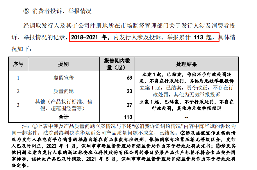 根據(jù)2022年4月為沖刺創(chuàng)業(yè)板IPO時(shí)八馬茶業(yè)披露的招股書(shū)顯示,在2018至2021年的三年內(nèi),八馬茶業(yè)涉及投訴、舉報(bào)累計(jì)113起,其中有接近半數(shù)涉及虛假宣傳,質(zhì)量問(wèn)題為23起,其他(產(chǎn)品執(zhí)行標(biāo)準(zhǔn)、售假、超范圍經(jīng)營(yíng)等)問(wèn)題27起。