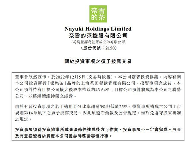 圖源:奈雪的茶關(guān)于投資事項(xiàng)之須予披露交易