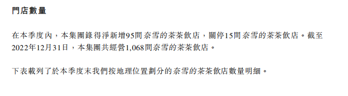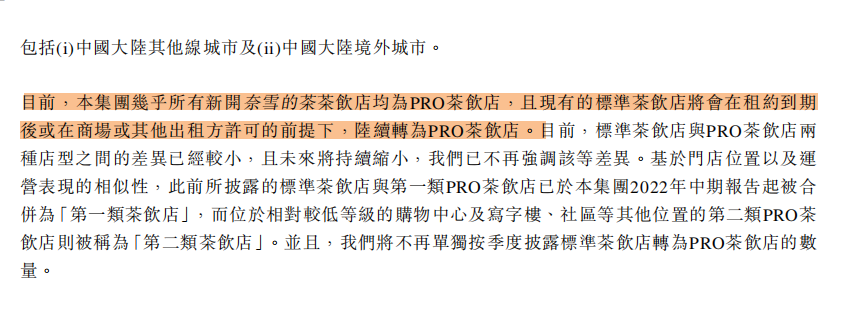 根據(jù)2022年第四季度運(yùn)營情況顯示,奈雪目前所披露的標(biāo)準(zhǔn)茶飲店與第一類PRO茶飲店已于本集團(tuán)2022年中期報(bào)告起被合并為第一類茶飲店。