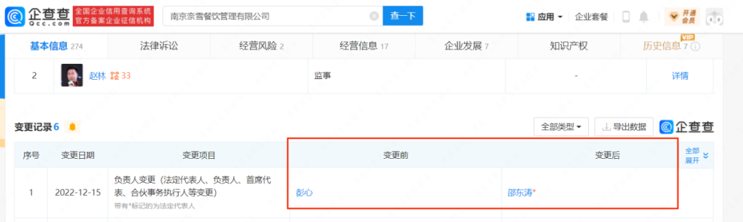 12月15日,南京奈雪餐飲管理有限公司的法人代表由彭心變更為邵東濤;