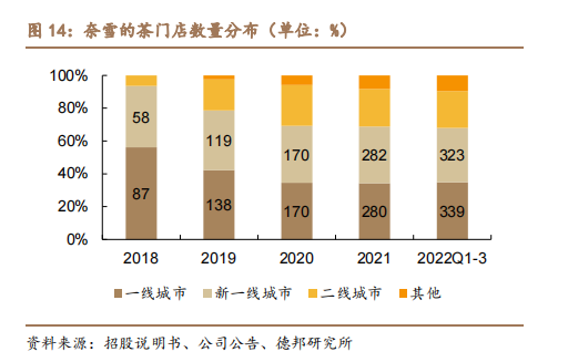 伴隨著品牌創(chuàng)立之初對(duì)標(biāo)的星巴克“大店模式”被逐步放棄,奈雪門店面積變小的同時(shí),門店選址也開始往一線以下的城市延伸。