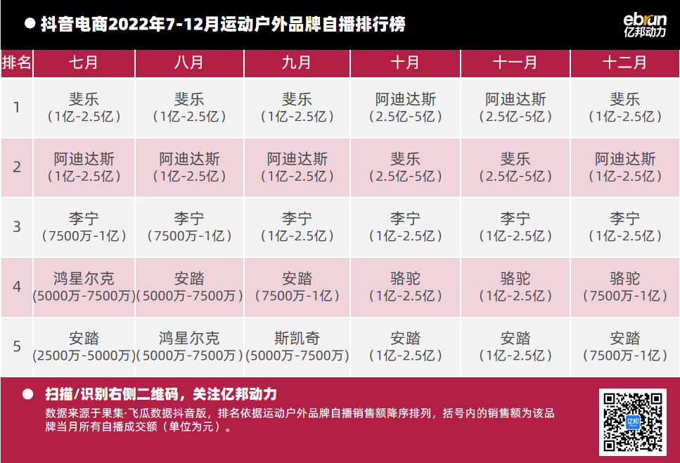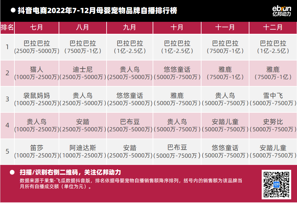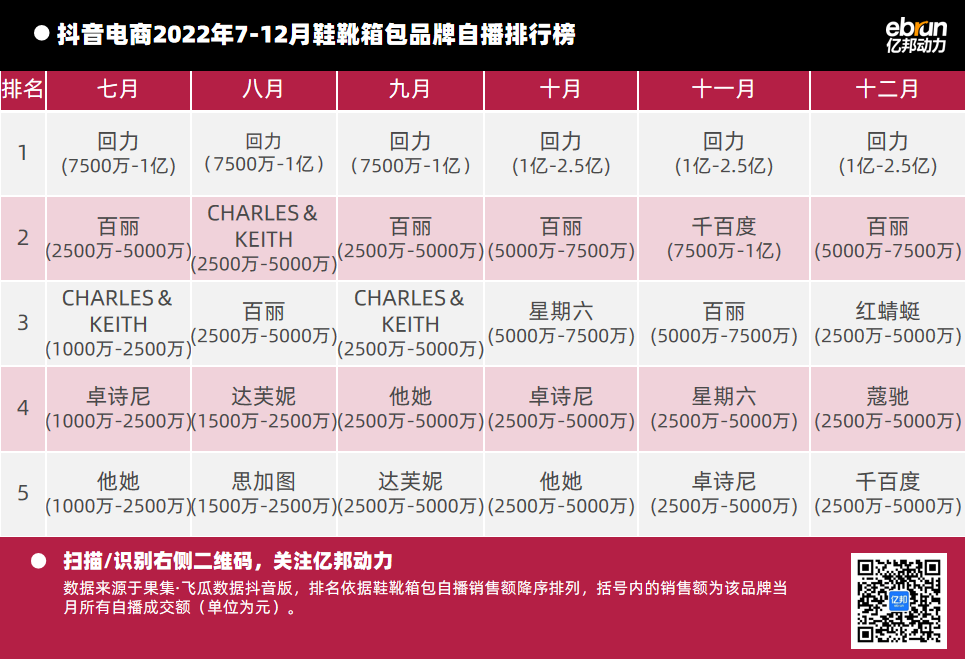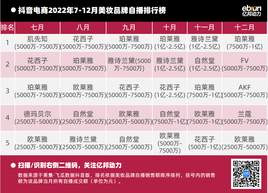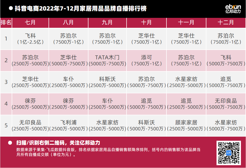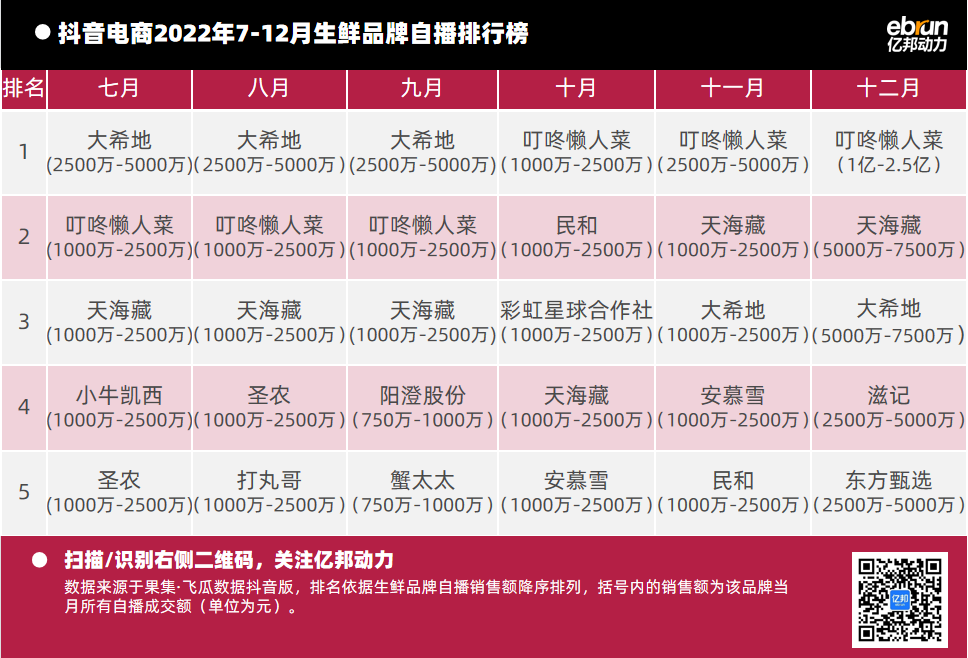 億邦動力根據(jù)“飛瓜數(shù)據(jù)(果集·飛瓜數(shù)據(jù)抖音版)”提供的數(shù)據(jù),盤點2022年7月-12月抖音自播總榜及20個垂直類目的榜單情況(按抖音銷售額進行排名)發(fā)現(xiàn):