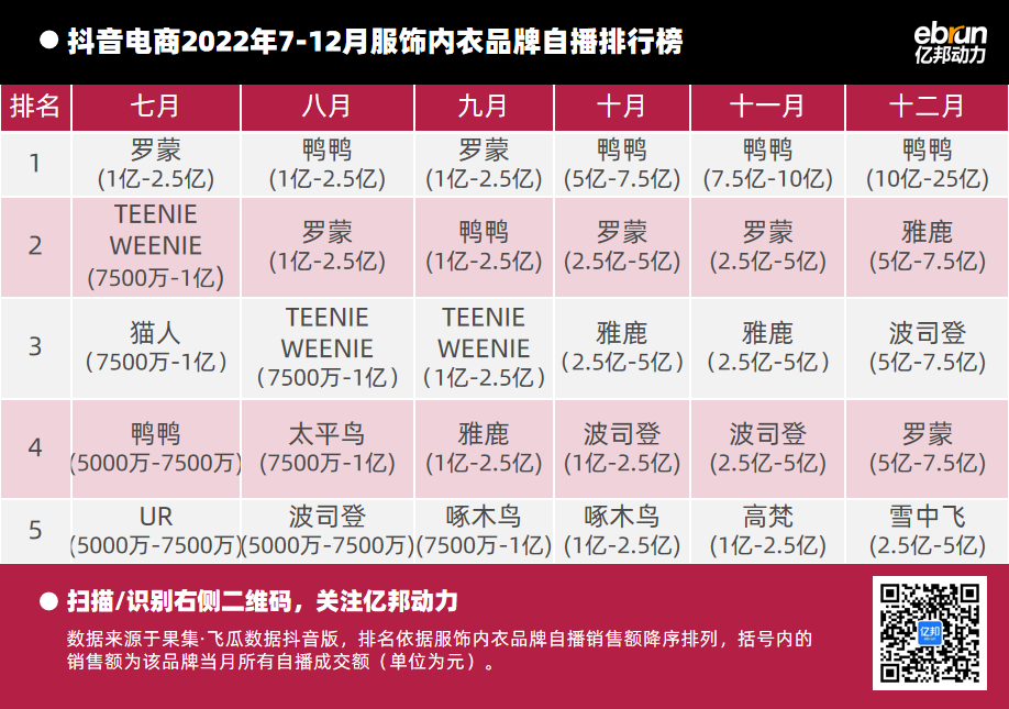 比如,2022年8月,羽絨服品牌鴨鴨沖進總榜后,排名不斷上升,連續(xù)3個月位列總榜TOP1;波司登上榜3次,12月沖進TOP3;內(nèi)衣品牌貓人一度沖上總榜,取得了TOP6的好成績。