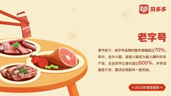 1月20日,拼多多發(fā)布了《2023年夜飯報告》。春節(jié)前夕,全國各地消費(fèi)者置辦年夜飯的熱情一路走高,肉類、水餃、湯圓、海鮮、水果、炒貨等多個年貨品類均實(shí)現(xiàn)翻倍增長。